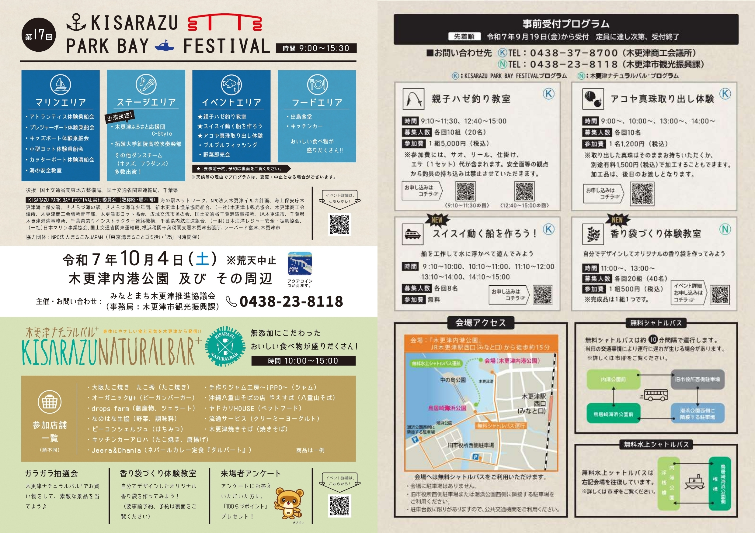 2025年10月4日(土)に、みなとまち木更津の歴史と文化に欠かせない海を満喫するイベント「KISARAZU PARK BAY FESTIVAL」が木更津内港公園で開催されます。