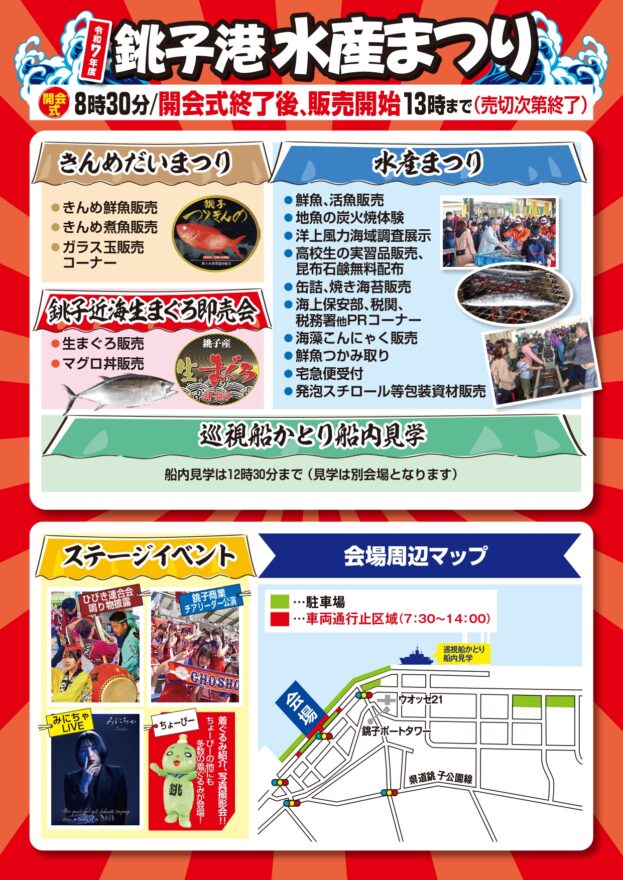 きんめだいの煮つけやあら汁の販売、近海生まぐろの即売など、銚子産水産物の魅力が満載のイベント。