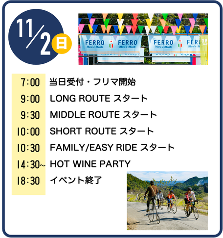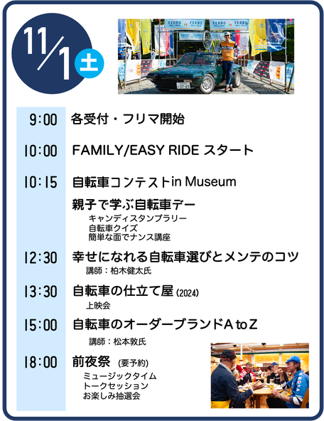 ライドではお気に入りのクラシックバイクでチェックポイントを巡り、仲間と語らいながら景色を満喫。さらに会場では、自転車フリーマーケットやファミリー向けイベント、文化セミナー、前夜祭など催しも盛りだくさん。