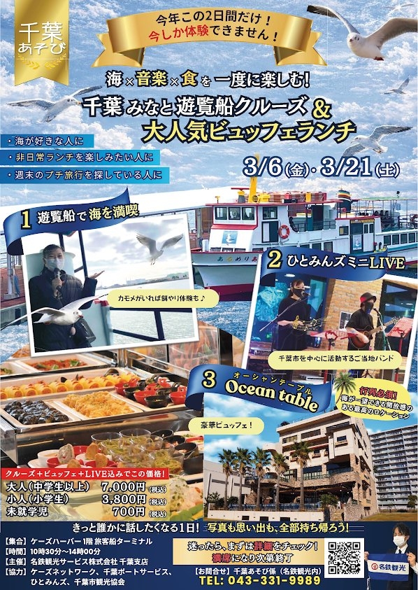 『ご当地バンドひとみんズと行く!千葉みなと遊覧船クルーズ&大人気ビュッフェランチ~かもめと遊べる海体験&ひとみんズ ミニLIVE at Ocean Table~』は、千葉市を中心に活動する親子音楽ユニット「ひとみんズ」と一緒に、千葉みなと遊覧船でのクルージング&大人気ビュッフェランチを満喫できるスペシャルプランです。