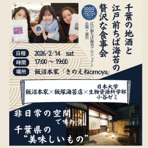 このイベントは、株式会社飯沼本家と日本大学生物資源科学部・小谷ゼミ「江戸前ちば海苔プロジェクト」との連携により開催されます。